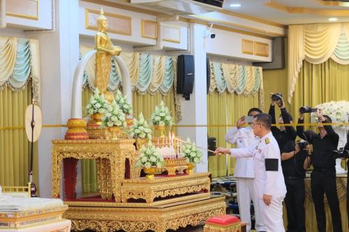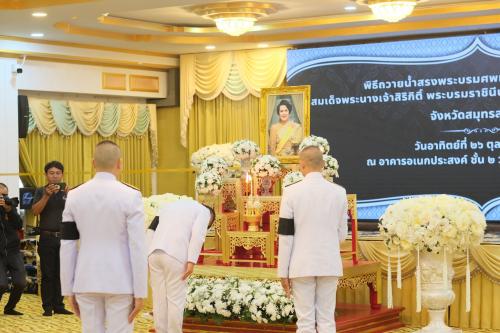 นายชยชัย แสงอินทร์ ผู้ว่าราชการจังหวัดสมุทรสงคราม เป็นประธานในพิธีถวายน้ำสรงพระบรมศพหน้าพระฉายาลักษณ์ สมเด็จพระนางเจ้าสิริกิติ์ พระบรมราชินีนาถ พระบรมราชชนนีพันปีหลวง พระราชสมุทรวชิรโสภณ ที่ปรึกษาเจ้าคณะภาค 15 เจ้าอาวาสวัดเพชรสมุทรวรวิหาร พระอารามหลวง เป็นประธานฝ่ายสงฆ์ มีนายกรกฎ วงษ์สุวรรณ รองผู้ว่าราชการจังหวัดสมุทรสงคราม นายรนัสถ์ชัย พุ่มเจริญ รองผู้ว่าราชการจังหวัดสมุทรสงคราม ผู้พิพากษาหัวหน้าศาล อัยการศาล ทหาร ตำรวจ สมาชิกวุฒิสภา นายอำเภอทั้งสามอำเภอ หัวหน้าสำนักงานจังหวัด หัวหน้าส่วนราชการ ข้าราชการเจ้าหน้าที่ หน่วยงานภาครัฐ ภาคเอกชน และประชาชน ร่วมพิธี ถวายน้ำสรงพระบรมศพหน้าพระฉายาลักษณ์ สมเด็จพระนางเจ้าสิริกิติ์ พระบรมราชินีนาถ พระบรมราชชนนีพันปีหลวง พร้อมกล่าวถวายความอาลัยสมเด็จพระนางเจ้าสิริกิติ์ พระบรมราชินีนาถ พระบรมราชชนนีพันปีหลวง ยื่นสงบนิ่งถวายความอาลัย และรับฟังสวดพระอภิธรรม ถวายจตุปัจจัยไธยธรรม ถวายผ้าบังสุกุล และลงนามแสดงความไว้อาลัย