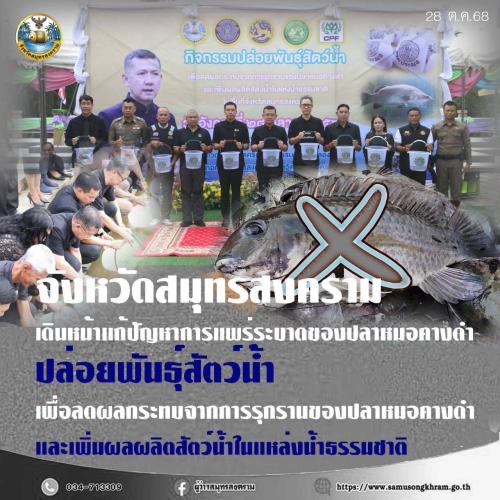 นายชยชัย แสงอินทร์ ผู้ว่าราชการจังหวัดสมุทรสงคราม เป็นประธานการจัดกิจกรรมปล่อยพันธุ์สัตว์น้ำเพื่อลดผลกระทบจากการรุกรานของปลาหมอคางดำ และเพิ่มผลผลิตสัตว์น้ำในแหล่งน้ำธรรมชาติในพื้นที่จังหวัดสมุทรสงคราม โดยมี นายกรกฎ วงษ์สุวรรณ รองผู้ว่าราชการจังหวัดสมุทรสงคราม นายรนัสถ์ชัย พุ่มเจริญ รองผู้ว่าราชการจังหวัดสมุทรสงคราม หัวหน้าส่วนราชการ ข้าราชการ และเจ้าหน้าที่ ร่วมกิจกรรมฯ